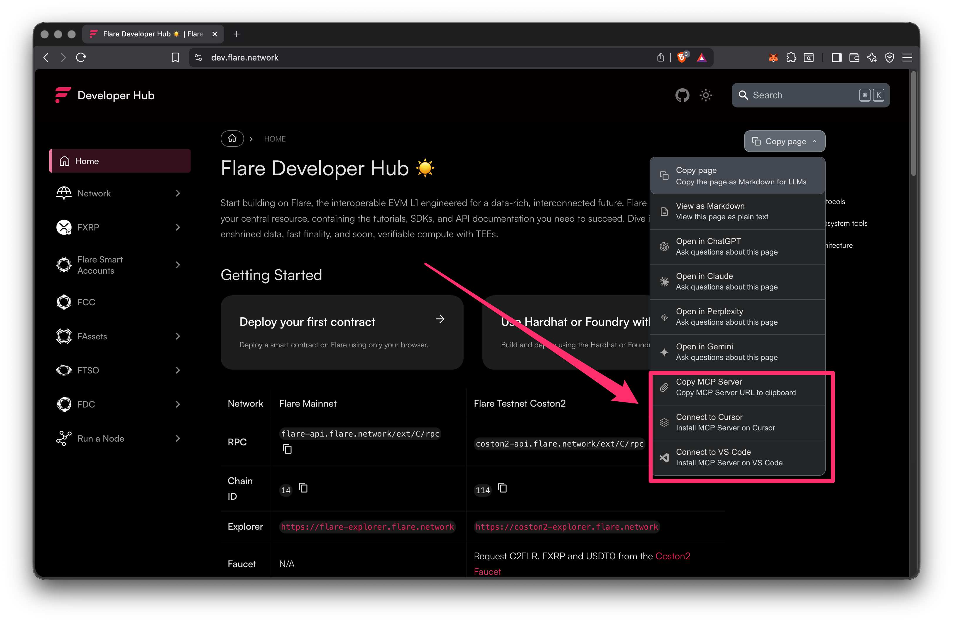 The fastest way to connect is directly from any page on the Flare Developer Hub. Click the Copy page button in the top-right corner and choose one of the MCP options from the dropdown: